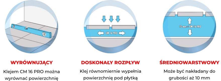 Zaprawa CM 16 PRO może być aplikowana w grubości do 10mm, która zapewnia: